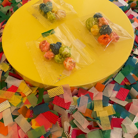 The next room was the one I was most excited about – the CONFETTI ROOM! I absolutely love confetti! There was confetti continuously falling from the ceiling (see the the rollers in the third picture below)! Nonstop-all day! What. a. DREAM! T and I spent the most time in this space. There was also some tasty local popcorn. Each color was a different flavor. Bubblegum, blueberry, lime, etc. I thought they would be a weird consistency, but they were actually really good!